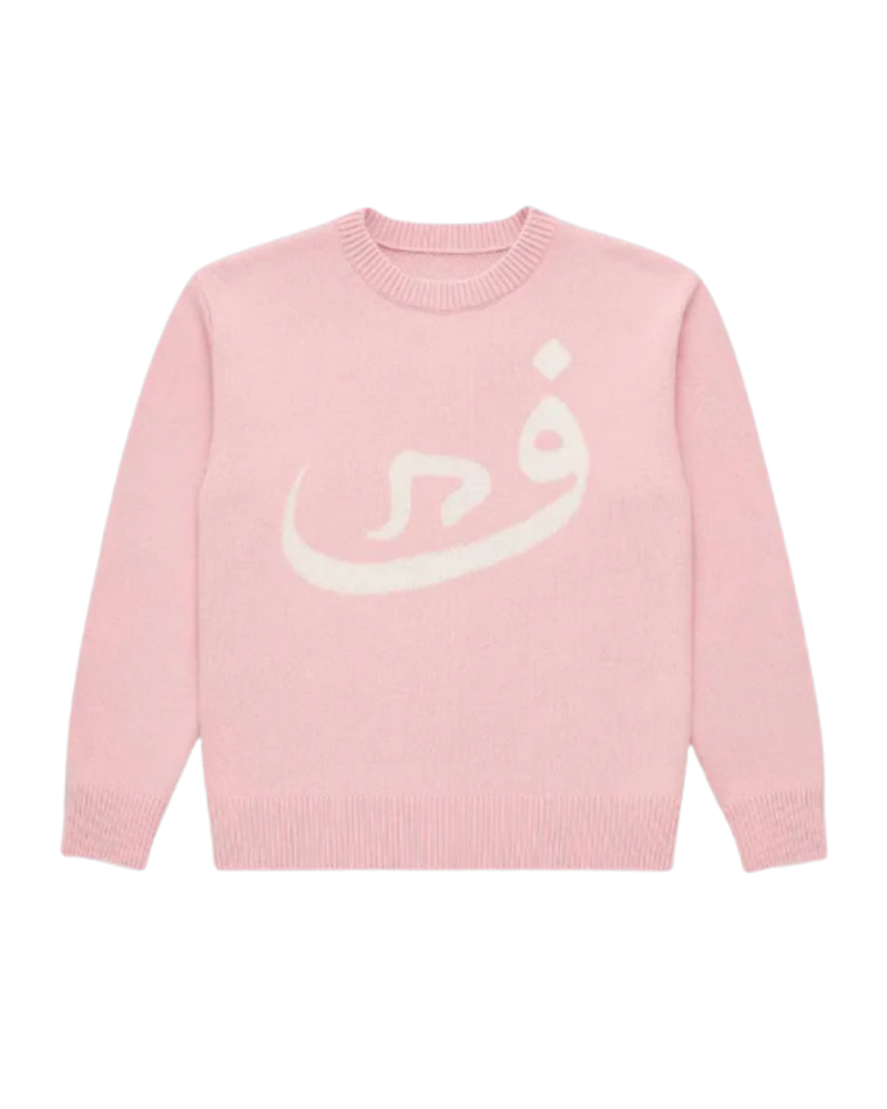SOFT POWER IN EVERY STITCH. This pastel pink sweater features Arabic calligraphy in bold contrast, combining comfort with a standout design.