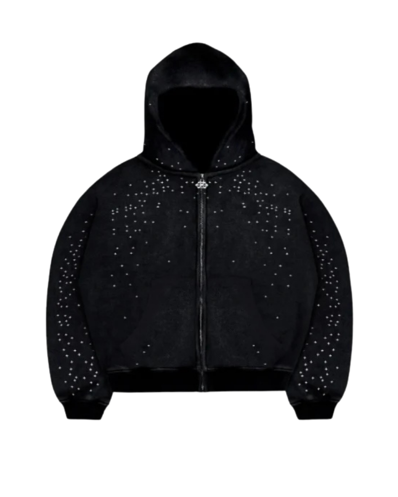 Shine in the shadows. The Stardust zip-up blends bold streetwear with subtle luxury, crafted from premium suede-style fabric and finished with a constellation of studded detailing across the chest, sleeves and back. Heavyweight feel, oversized fit. Made to stand out.